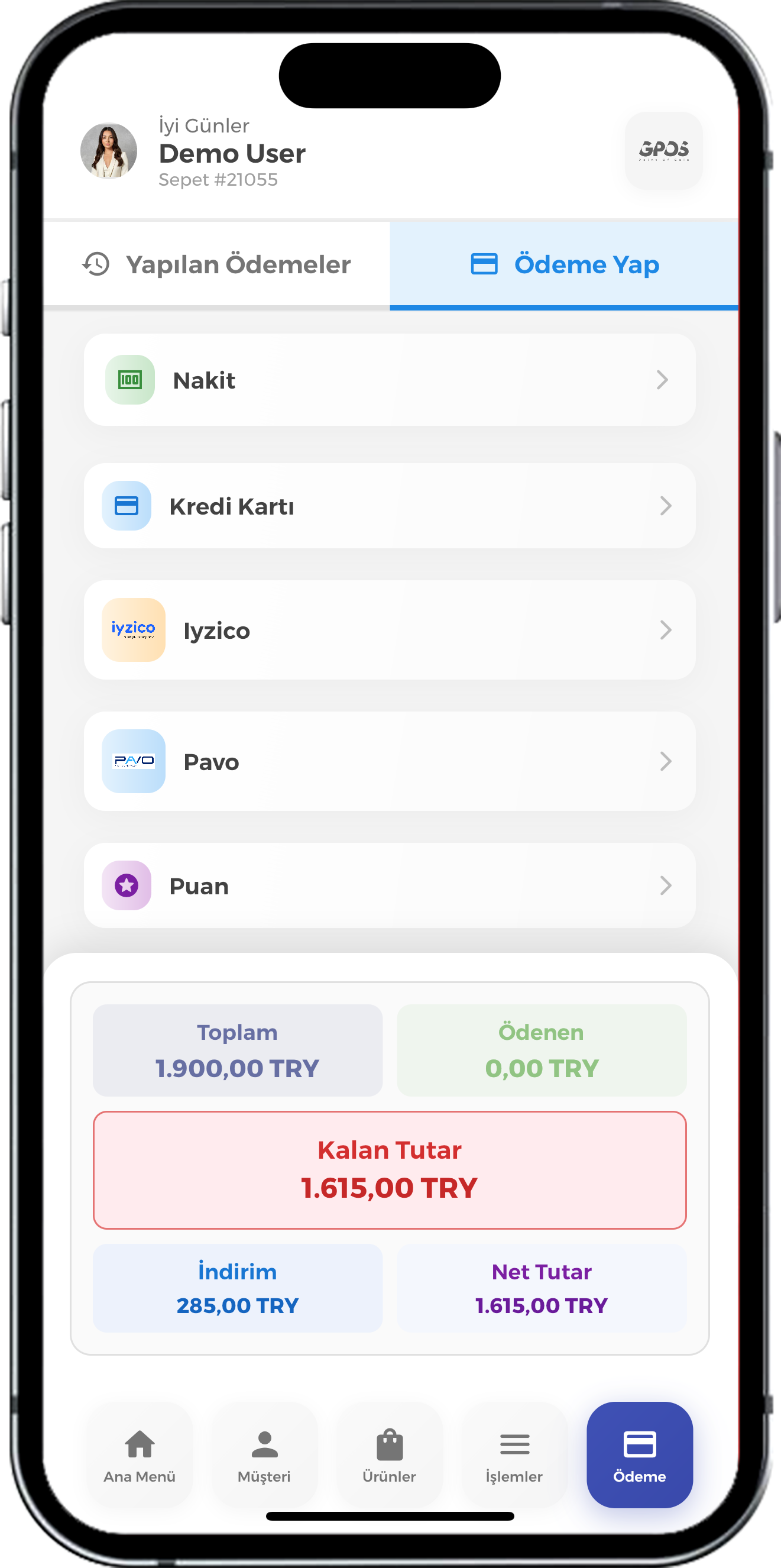 GPOS; akıllı telefonlar, tabletler ve diğer mobil cihazlarda sorunsuz çalışır. Kullanıcı dostu arayüzü sayesinde ödeme yapmak veya ödeme almak için ekstra kurulum gerekmez, her zaman yanınızdadır.
